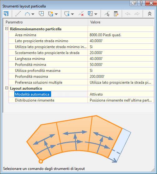Quando viene attivata la modalità automatica, dopo avere specificato i punti iniziale e finale del lato prospiciente la strada, l'anteprima degli elementi grafici consente di visualizzare le nuove particelle proposte, basate sui criteri specificati. Se si accetta la soluzione proposta, quale l'esempio nella figura 4, le particelle vengono create simultaneamente.