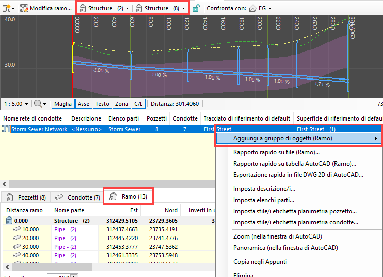- Aprire la scheda Reti di condotte della finestra Project Explorer principale. Dalla barra degli strumenti principale, impostare il pozzetto iniziale della vista profilo della rete di condotte su Structure - (2) e il pozzetto finale su Structure - (8). Questa operazione consente di determinare il percorso del ramo visualizzato. Impostare la superficie di confronto del ramo su First Street - (1).
