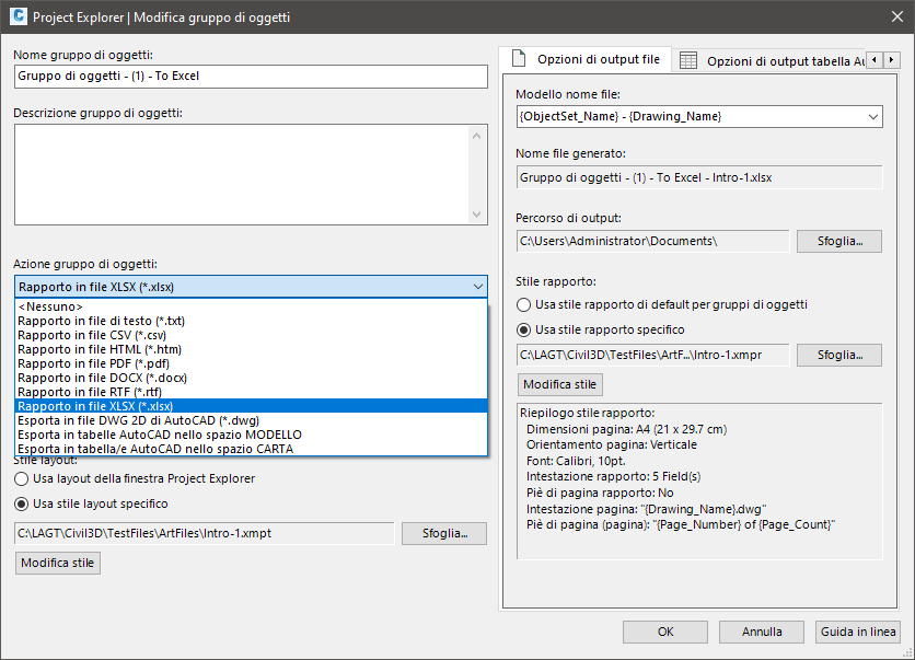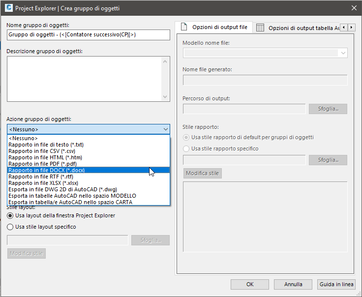 Osservare che il nome file del file di rapporto in uscita può essere derivato da una serie di variabili dinamiche, oppure è possibile specificare un nome file fisso in questa finestra di dialogo. In questo caso, verrà utilizzata l'opzione di default, il nome del file in uscita sarà composto da una combinazione del nome del gruppo di oggetti e nome Carta.