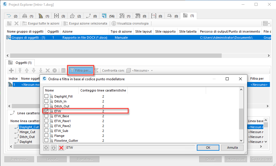 - Facoltativamente, è ora possibile specificare le linee caratteristiche del modellatore da includere nel rapporto aggiungendo un filtro codice punto. Fare clic sul pulsante Aggiungi/modifica filtro per aprire la finestra di dialogo Ordina e filtra contenuto. Selezionare il codice punto ETW e fare clic su OK.
