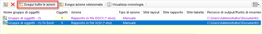 - Fare clic sul pulsante Esegui tutte le azioni nella barra degli strumenti principale. Le azioni vengono elaborate da tutti i gruppi di oggetti nella Carta. Come conseguenza, il rapporto verrà scritto contemporaneamente in un file DOCX e in un file XLSX. Rivedere i file risultanti in Microsoft Word e Microsoft Excel.