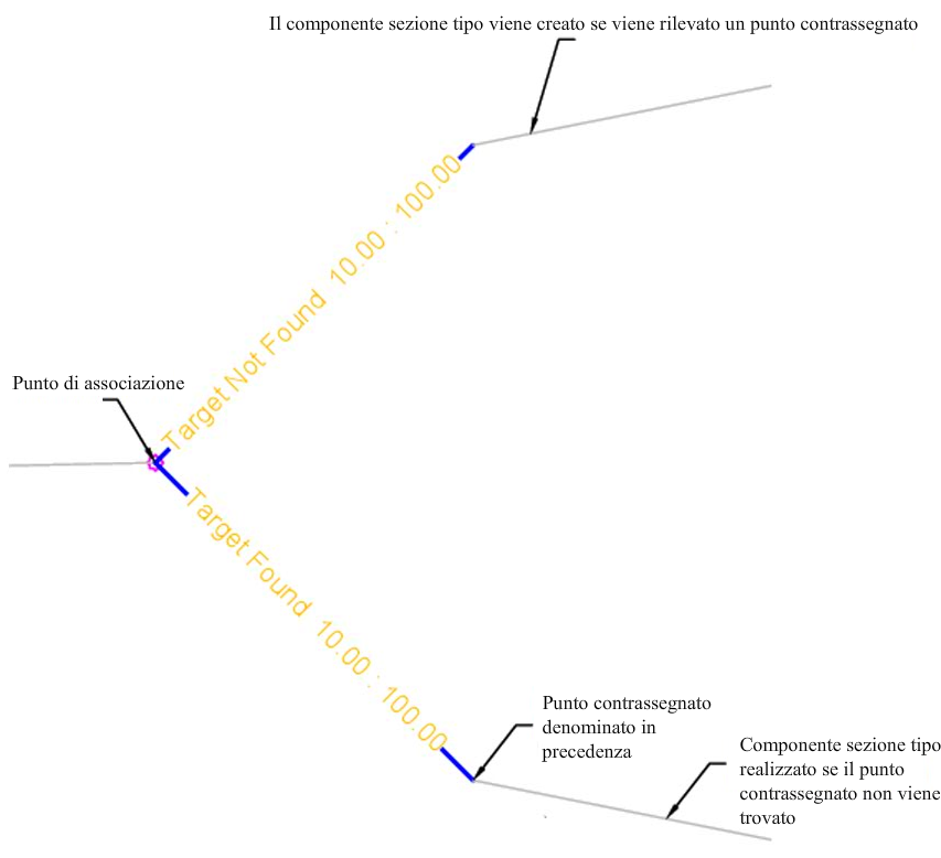 | Condizione | Specifica la condizione disponibile per il componente sezione tipo. La condizione Trovato viene elaborata se il nome del punto contrassegnato viene rilevato entro la distanza massima. La condizione Non trovato viene elaborata se il nome di un punto contrassegnato non è stato impostato oppure non viene rilevato nella progressiva entro la distanza massima. | Trovato/Non trovato | Trovato |