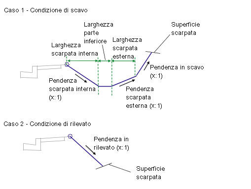 Il punto di associazione viene verificato per determinare se si trova in scavo o in rilevato. Se si trova in rilevato, il collegamento in rilevato della scarpata viene esteso alla Superficie scarpata secondo la Pendenza in rilevato specificata. Se si trova in scavo, vengono aggiunti la scarpatina interna, il fondo del fosso e la scarpatina esterna, e il collegamento in scavo della scarpata viene esteso dalla fine della scarpatina esterna alla Superficie scarpata secondo la Pendenza in scavo specificata.