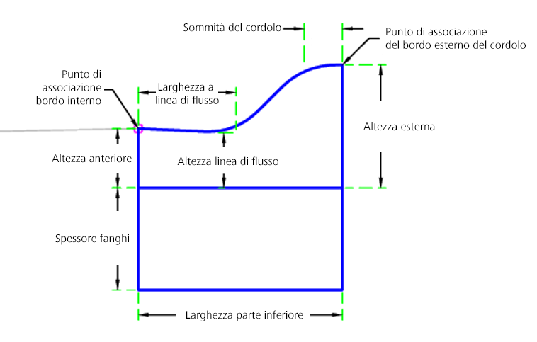 I collegamenti di cordolo e cunetta vengono inseriti in base alle quote dei parametri di input. Tutte le quote devono essere positive e devono avere valori diversi da zero.