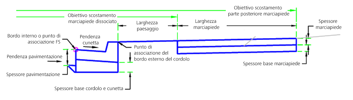 | Scostamento marciapiede dissociato | Può essere utilizzato per sostituire il valore fisso della larghezza del marciapiede e collegare il bordo interno del marciapiede ad un tracciato scostamento. Come obiettivi per la specifica della larghezza è possibile utilizzare i seguenti tipi di oggetti: tracciati, polilinee, linee caratteristiche o figure di rilievo. | Facoltativo |