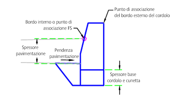| Punto di associazione | Punto di associazione del cordolo o di cordolo e cunetta | Bordo interno o FS/Esterno del cordolo | Bordo interno o FS |