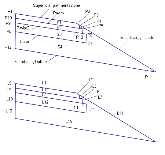I collegamenti Pavimentazione1, Pavimentazione2 e Superficie esistente vengono inseriti parallelamente alla finitura, in base ai valori di spessore specificati. Se i valori di estensione strato sono valori diversi da zero, ciascuno strato viene esteso per la distanza specificata oltre il punto di cardine della banchina. Se uno strato si estende oltre la pendenza della scarpata, lo strato termina in corrispondenza dell'intersezione della pendenza. Ogni strato deve essere largo quanto o più dello strato sovrastante.