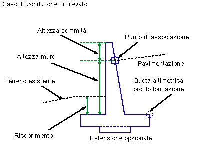 Questo componente sezione tipo può essere inserito sul lato destro o sinistro. Il punto di associazione è diverso per la condizione di scavo o rilevato. Nella condizione di rilevato, si suppone che tale punto si trovi laddove la finitura interseca la faccia interna del muro, ad una distanza pari all'Altezza sommità sotto la parte superiore del muro. Nella condizione di scavo, si suppone che il punto di associazione si trovi laddove la finitura interseca la faccia interna, ad una distanza pari al Ricoprimento fondazione sopra la parte superiore della fondazione. L'altezza del muro viene determinata in base all'input di Altezza muro o Profilo.
