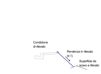 Il punto di associazione viene verificato per determinare se si trova in scavo o in rilevato. Se si trova in rilevato, il collegamento in rilevato della scarpata viene esteso alla superficie esistente secondo la pendenza in rilevato specificata.