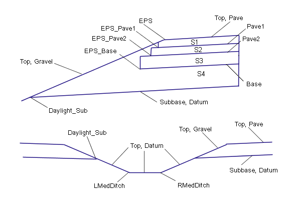 Le banchine pavimentate seguono le pendenze definite per le pendenze della banchina interna destra e sinistra in relazione alle specifiche di sopraelevazione dei tracciati di linea base. Queste pendenze sono applicate verso l'interno dai cigli interni delle corsie. Le superfici di sottobase seguono la stessa pendenza della finitura e si estendono all'interno verso le intersezioni con le pendenze del fosso.