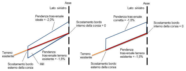 La pendenza trasversale corretta è sempre impostata sullo stesso valore della pendenza del terreno esistente.