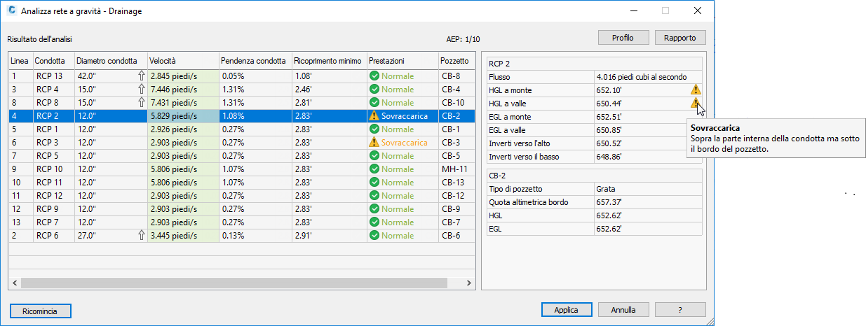 Quando si seleziona una riga nella tabella dei risultati, il riquadro a destra mostra informazioni dettagliate sulla condotta e sul pozzetto nella linea selezionata. Vengono visualizzati i diversi dettagli a seconda dei tipi di analisi selezionati nella pagina Generale.