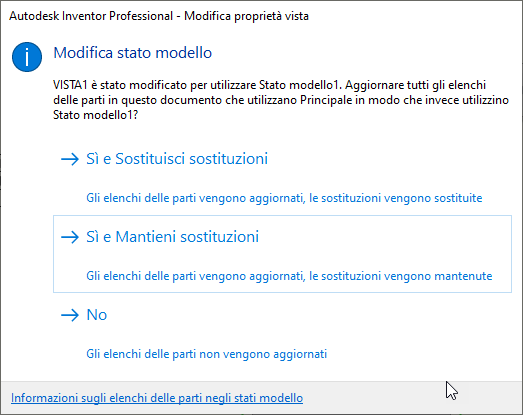 - Sì e Mantieni sostituzioni Selezionare questa opzione se si desidera che gli elenchi delle parti facciano riferimento alla distinta componenti del nuovo stato modello e continuino ad utilizzare le sostituzioni esistenti.