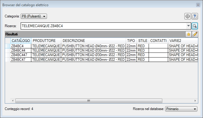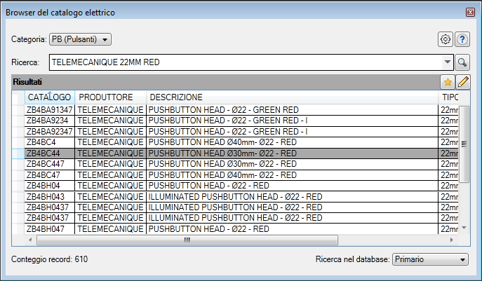 Se la parte è associata ad un catalogo, il valore di catalogo viene preselezionato nel Browser del catalogo elettrico.