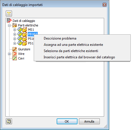 Selezionare una parte elettrica nella finestra di dialogo Dati di cablaggio importati.