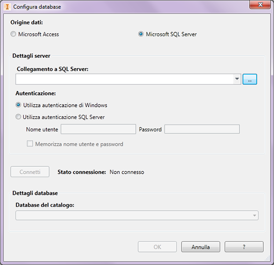 Specificare il tipo di database per l'origine delle informazioni di catalogo.