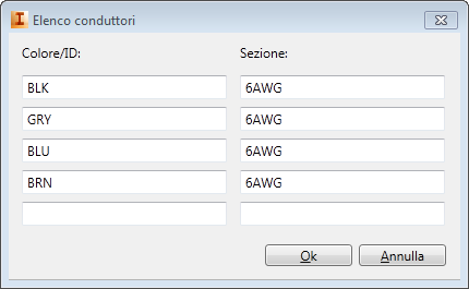 Fare clic per aprire la finestra di dialogo Elenco conduttori, in cui è possibile aggiungere conduttori e definire il colore e il gauge per ogni conduttore.
