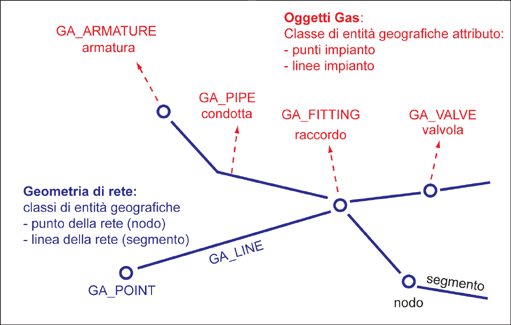Gli oggetti Gas relativi ai punti dell'impianto sono memorizzati nelle classi di entità geografiche attributo GA_POINT.FID_ATTR, quelli relativi alle linee dell'impianto nelle classi di entità geografiche attributo GA_LINE.FID_ATTR. Sono correlati alla classe di entità geografiche della linea o del punto della geometria. |