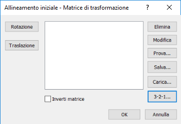 Ad esempio, la finestra di dialogo CAD - Matrice di trasformazione visualizza un pulsante Specchia e scala. La finestra di dialogo Allineamento iniziale - Matrice di trasformazione visualizza un pulsante 3-2-1.