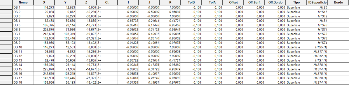 - Tipo di punto: SP indica un punto di superficie; EP indica un punto di bordo.