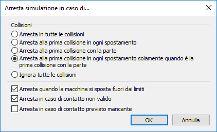 - Arresta in tutte le collisioni per visualizzare un messaggio di errore e sospendere la simulazione a ogni collisione con la parte.