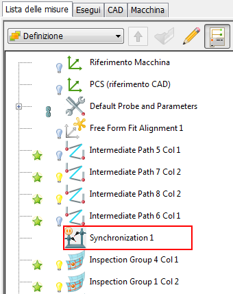 Ad esempio, nella sequenza di ispezione qui di seguito, l'elemento Sincronizzazione obbliga PowerInspect a completare tutti gli elementi precedenti prima di consentire alle teste di proseguire con la misurazione dei gruppi di ispezioni: