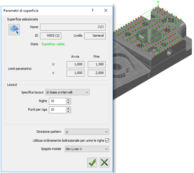L'opzione In base a intervalli della finestra di dialogo Parametri di superficie è simile al metodo Raster, eccetto per il fatto che consente di limitare il percorso a una superficie specificata. Per creare un percorso sonda utilizzando degli intervalli, inserire il numero di righe e Punti per riga per il percorso sonda. PowerInspect crea un percorso in cui le righe e i punti sonda sono spaziati in modo uniforme sulla superficie nelle direzioni u e v. Ad esempio: