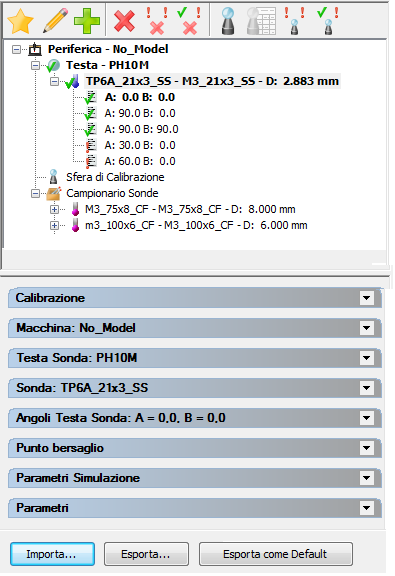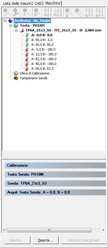 Per visualizzare e gestire il database sonde e visualizzare i dettagli di calibrazione di una macchina CMM, fare clic sulla scheda Strumenti > pannello Macchina > Sonde. I dettagli della sonda in uso e le relative calibrazioni attuali vengono visualizzati nella finestra di dialogo Configurazione macchina.