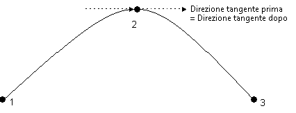 È possibile impostare le direzioni delle tangenti prima e dopo il punto in modo indipendente o entrambe insieme. Se sono impostate insieme, la curva è uniforme rispetto alle sue tangenti presso quel punto. La figura seguente mostra un esempio in cui la direzione della tangente prima è uguale alla direzione della tangente dopo presso il punto 2.