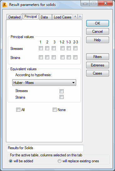 Select the Principal (solids) tab in the Columns dialog to select stresses or strains for presentation.