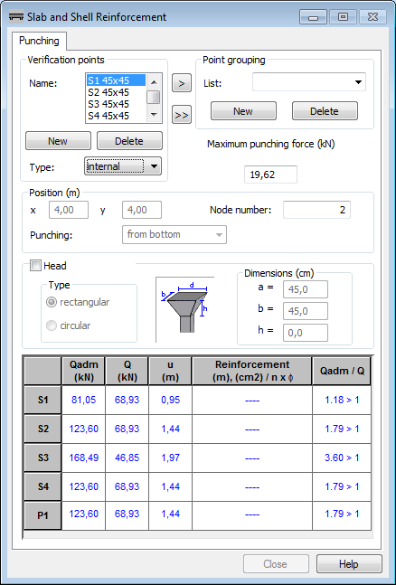 In the punching analysis for each verification point table, the following values are presented.