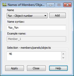 At the bottom of the dialog, is the Selection - members/panels/objects field. This field is used to specify numbers of members, objects, or panels which should be assigned the name specified by the name syntax.