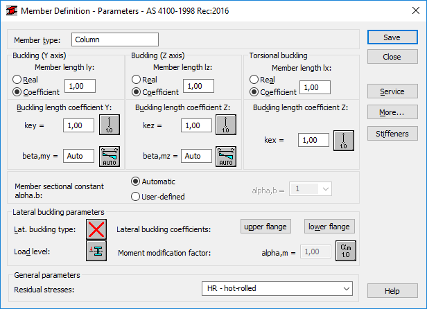 The member sectional constant is used to select the member sectional constant alpha,b, which determines a buckling coefficient. A value of the member sectional constant can be selected automatically, based on the section type and class.