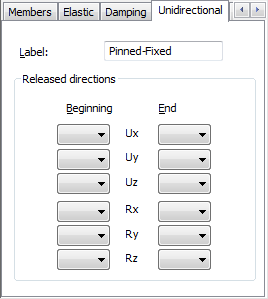 For example, to define a release for the member in the previous image that makes this member only a tension member, define the release of the Ux+ direction at the beginning of the member or the release of the Ux- direction at the end of the member.