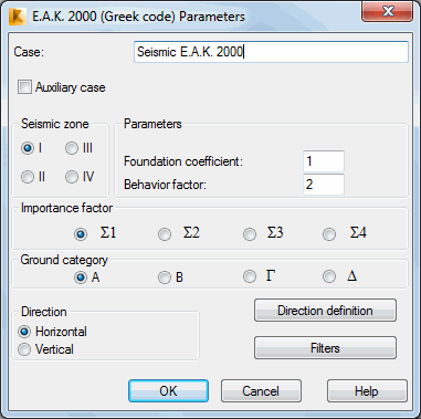 Parameters of a structure seismic analysis depend on a seismic code used during calculations of a structure influenced by seismic impact. Select Greek seismic code E.A.K. 2000 or E.A.K 2000/2003 in the New Case Definition dialog or click Parameters in the Analysis Type dialog.
