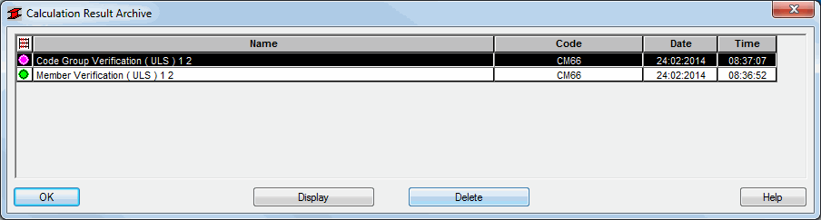 Calculation results saved in the archive are opened by selecting the calculation result in the table and clicking the Display button. To display results of several sessions of member verification / design, highlight several lines, and the appropriate short result windows will open.