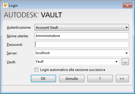 - Questa opzione è disponibile solo in Autodesk Vault Professional.Se si dispone di un account Microsoft Windows Active Directory, è possibile eseguire il login ad Autodesk Data Management Server utilizzando le credenziali dell'account utente di Microsoft Windows. Selezionare Account Windows dal menu a discesa Autenticazione.