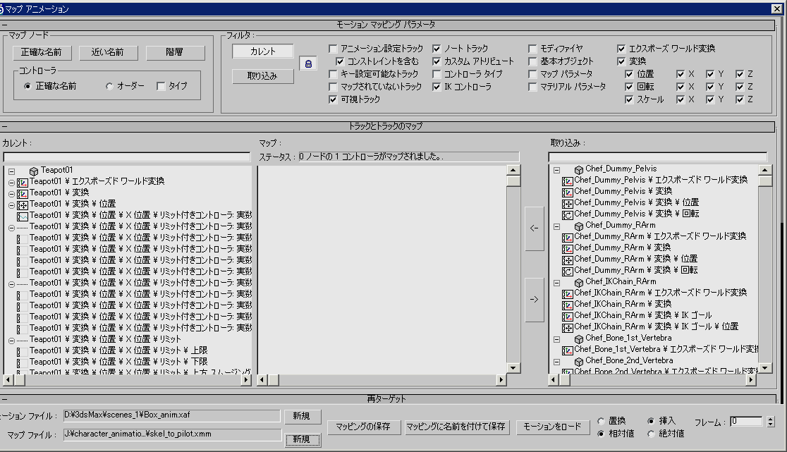 [マップ アニメーション](Map Animation)ダイアログ ボックス ボックスでは、[アニメーションをロード](Load Animation)コマンドを使用して取り込んだアニメーション トラックを割り当てられます。このダイアログ ボックスのサイズは変更できます。画面には、基本パラメータを設定するロールアウト、マッピングを実行するロールアウト、および再ターゲットを行うロールアウトが表示されます。