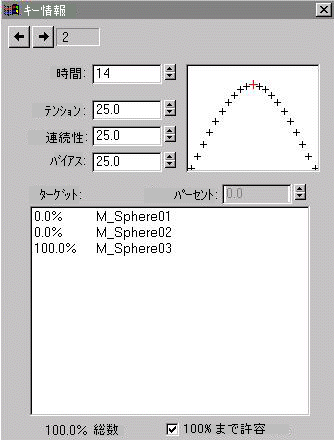 オブジェクトのモーフ ターゲットをリストします。これらのターゲットの現在のキーにおける影響率も表示されます。ウィンドウ下部には、すべてのターゲットの影響率の合計値が表示されます。このウィンドウで任意のターゲットを選択すると、その影響率を右側のスピナーで調整できます。