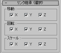 チェック ボックスにチェックマークを付けると、親からの変形情報が、選択した軸について、選択したオブジェクトに伝えられます。チェック ボックスのチェックマークを消すと、その軸に関する変形情報は、選択したオブジェクトで無視されます。