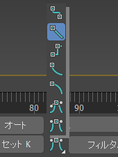 このフライアウトを使用すると、[セット キー](Set Key)モードまたは[オート キー](Auto Key)モードで作成した新しいキーの既定値の接線タイプを簡単に設定できます。また、[キー情報(基本機能)](Key Info (Basic))ロールアウトやカーブ エディタの[キー接線](Key Tangency)ツールバーから接線タイプにアクセスできます。