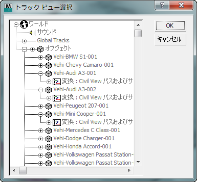 3ds Max は、[トラック ビューを選択](Track View Pick)サブダイアログ ボックスを開きます。 このダイアログ ボックスには、トラック ビュー階層に類似した内容が表示されます。