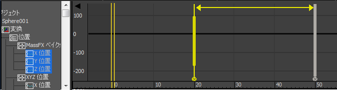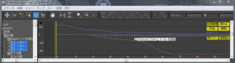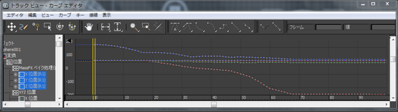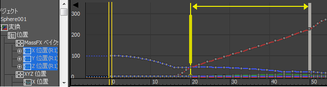 ハイライト表示されたトラックからキーとカーブのみが表示されているのがわかります。その名前は[X 位置](X Position)(R1)と[Y 回転](Y Rotation)(R1)に変化しています。 これは、トラックがリタイマ 1 の制御下にあることを示します。