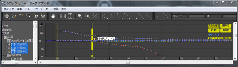 これにより、ハイライト表示されたトラックのアニメーションがリタイマの影響から除外されます。 リタイマは残りますが、オブジェクトの動作の影響は抑止されます。 オブジェクトのカーブがキー ウィンドウから消えて、このリタイマでアニメーションが編集できないことを示します。