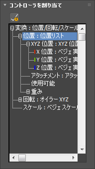 [アニメーション](Animation)メニューを使用してコントローラを割り当てる場合は、選択したコントローラがリストの先頭に配置された状態で、リスト コントローラが自動的に既定として割り当てられます。この動作は、[モーション](Motion)パネルやトラック ビューでコントローラを割り当てる場合(指定されたコントローラしか割り当てられない)とは異なります。