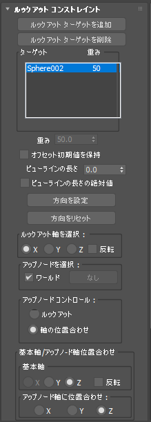 [ルックアット コンストレイント](LookAt Constraint)は、オブジェクトが常に別のオブジェクトの方向を向くように、オブジェクトを制御します。 オブジェクトの回転を固定して、いずれかの軸がターゲット オブジェクトまたはターゲット位置の加重平均の方向にあるようにします。 ルックアット軸はターゲットの方向を示しますが、アップノード軸は上方向を示す軸を定義します。同時に設定すると反転する場合があります。 ターゲット カメラを真上に向けるのと同じことです。
