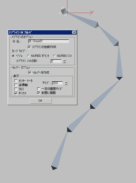 ボーン構造がスプラインにジャンプして、形が現れます。スプライン上の各頂点にはヘルパーが作成されています。パス コンストレイントがルート ボーンに自動的に割り当てられ、ルート ボーンがスプラインの終端のヘルパーや頂点に制限されます。