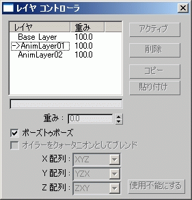 リスト内のコントローラ間のブレンドを有効にします。レイヤ コントローラを回転トラックに割り当てる場合にのみ使用可能です。 既定値ではチェックマークが付いていません。