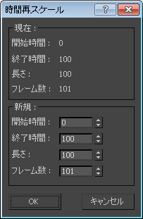 時間再スケールは全トラックのすべてのキー位置を再配置します。結果として、アニメーションの再生で使用するフレーム数に増減が生じ、再生速度も変化します。