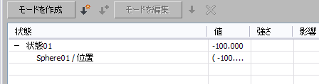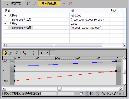 これはリアクション コントローラで使用される制御メカニズムの基本を示した例です。ドライバ/ドリブン オブジェクトの組み合わせごとに、任意の数の状態を指定できます。状態はドライバ トラックとドリブン トラックの値で定義します。ドライバを追加したときに自動的に作成される最初の状態は、ボックス オブジェクトが X 軸の -100 の位置にあるとき、球オブジェクトは(-100,0,50)に位置することを指定します。この場合では、3 つのパラメータ(球オブジェクトの 3 つの軸上の位置)と、1 つのパラメータ(ボックス オブジェクトの X 軸上の位置)を制御しています。一般的には、1:1 の比率のドライバ/ドリブン パラメータを使用します。